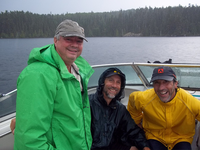 Dan checks the depth finder as he cruises through Musk Bay. He mistakes 3.2 feet for 32 feet...prop destroyed. Engine stalled. Dan and Bry paddle against the wind out to the center of the lake, Matt sends SOSs on the horn. Thankfully, another group is in the area. Why are they coming this way so slowly? Can't they hear our distress call? Ah, they've fished this lake before, and would never move quickly given all the submerged rocks. Towed to camp, prop replaced, engined checked, back out the next day.